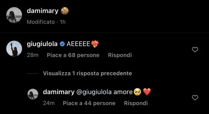 Danimary, cugina di Sangio, ha risposto a Giugiulola scrivendo “amore” con una faccina commossa e un cuoricino rosso. La ballerina aveva commentato con un simpaticissimo “AEEEE”, accompagnato da un cuore rosso infuocato. Tutto ok dunque tra Sangio e Lola. La ballerina e il cantante continuano a essere felicissimi insieme. L’artista romana sembra davvero a suo agio anche con la cugina del cantautore vicentino. Lunga vita ai #SANGIULIA: la coppia più bella, pura e dolce che ci sia.