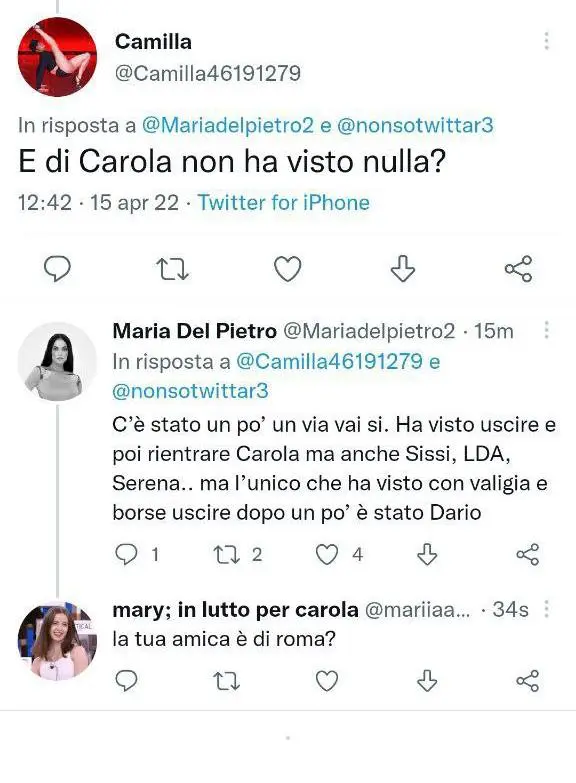 In particolare, secondo quanto raccolto dalla nostra Redazione sui social, e come vi dicevamo anche noi Mercoledì nelle anticipazioni sulla quinta puntata del Serale di Amici 21, dopo un via vai di diversi ragazzi, Carola e altri compagni sarebbero rientrati in casetta. Dario Schirone invece, si sarebbe allontanato con la sua valigia. Ecco la foto in cui trovate tutti i dettagli sulla segnalazione pervenuta alla Redazione di Angolodellenotizie.com: