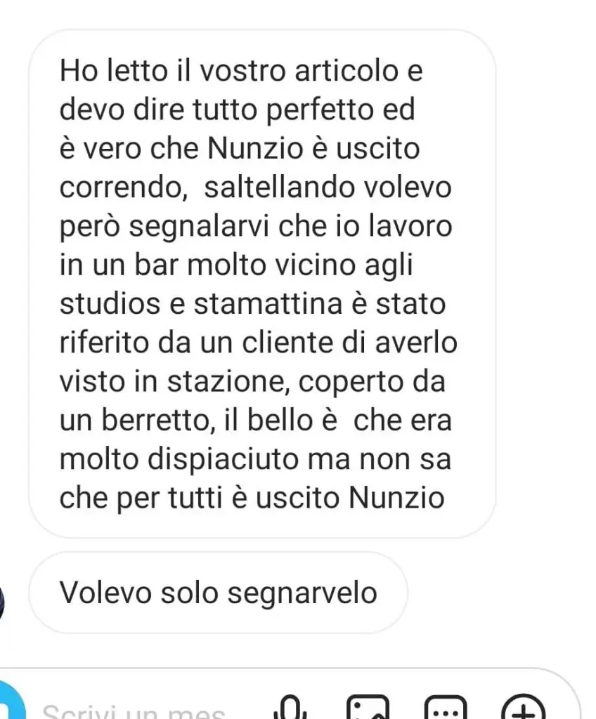 Ringraziamo tutti gli utenti che ripongono fiducia ogni giorno in noi e nel nostro lavoro, cerchiamo di essere sempre sul pezzo, rapidi nel darvi notizie e ci seguite davvero in tanti. Noi troviamo surreale questa notizia, anche se come detto, tutto può accadere. Ma visto che sono davvero tante le segnalazioni, pensiamo che a rischiare sia Lda e che Nunzio fosse solo felice di essere rimasto. Sappiamo che è una notizia che stiamo dando solo noi , ma ci sembra corretta darla. Uscirà davvero Nunzio? O come segnalato sarà Lda. E la persona vista è veramente il cantante napoletano? Ci limitiamo solo a dare voce al pubblico social web. Non ci resta che attendere sabato per scoprirlo. Restate connessi e occhi aperti! Lda è l’eliminato.