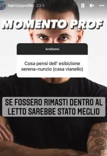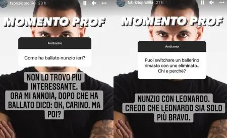 Il prof, aveva dichiarato in precedenza di vedere tra i possibili finalisti anche Serena e Nunzio, per poi in questo post, fare retromarcia, commentando addirittura negativamente l’esibizione. Insomma, Prolli ha cambiato le sue preferenze o semplicemente si è fermato a commentare qualcosa che sabato non ha gradito? Nelle successive Stories, infatti ha dichiarato che Nunzio non lo trova più interessante ma addirittura noioso.