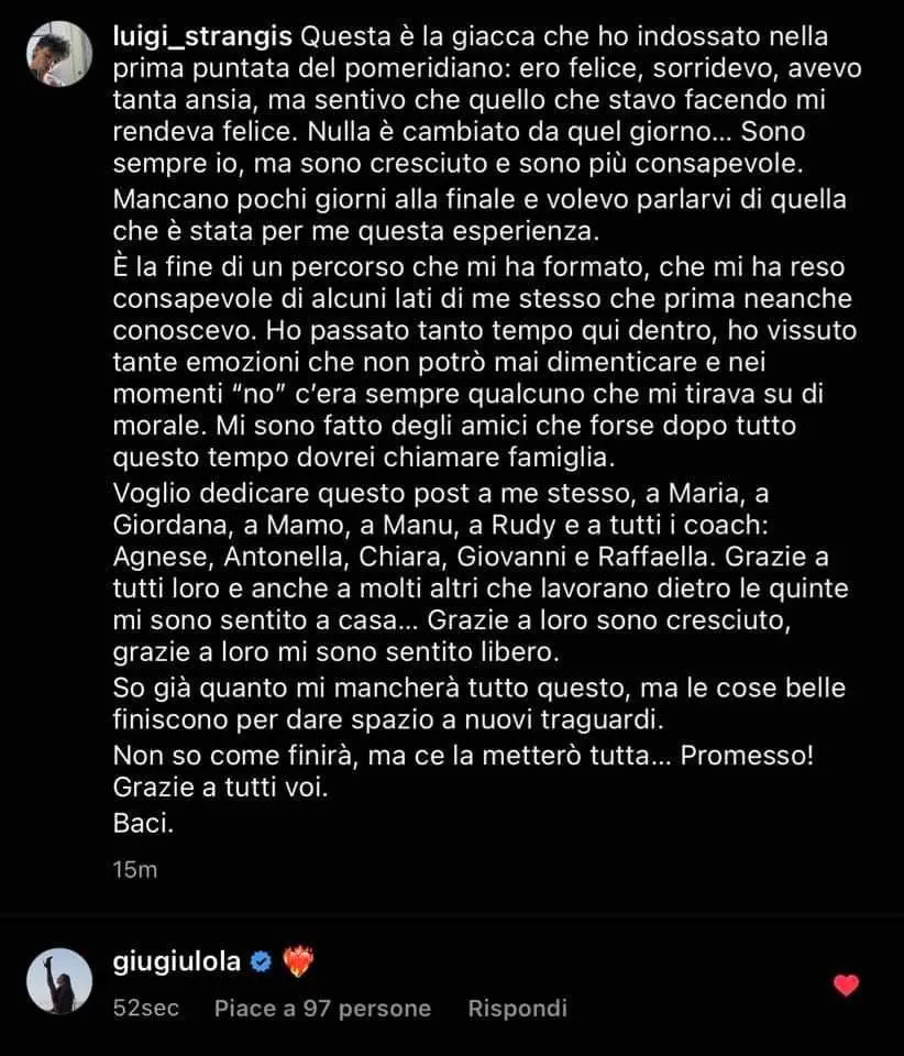 Un post davvero meraviglioso, in cui Luigi Strangis, autore di uno splendido percorso all’interno della scuola più famosa d’Italia, si mette a nudo anche e soprattutto come persona, oltre che come artista. L’allievo del Prof. Rudy Zerbi ha conquistato man mano maggior consapevolezza nei suoi mezzi e nonostante non sia ancora arrivato il primo disco d’oro, Luigi è comunque tra i favoriti per la vittoria finale nel circuito canto. Subito virale inoltre il commento di Giulia Stabile, ballerina professionista amatissima dai fan e detentrice del titolo della passata edizione. Insomma, domani andrà in onda la Finale di Amici su Canale 5 e Luigi è già bello carico: restate connessi!