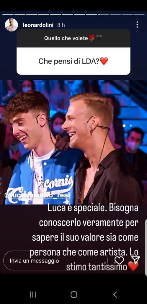 AMICI 21: LEONARDO LINI PARLA DI LDA- Leonardo Lini, ex allievo della Prof. Alessandra Celentano, ha risposto ad alcune domande dei suoi numerosi followers su Instagram. In particolare, il ballerino di latino-americano ha parlato anche del suo rapporto con Luca D’Alessio, ex cantante del Prof. Rudy Zerbi, eliminato alla 6a puntata del Serale. Ecco lo scatto pubblicato sul profilo ufficiale del ballerino: