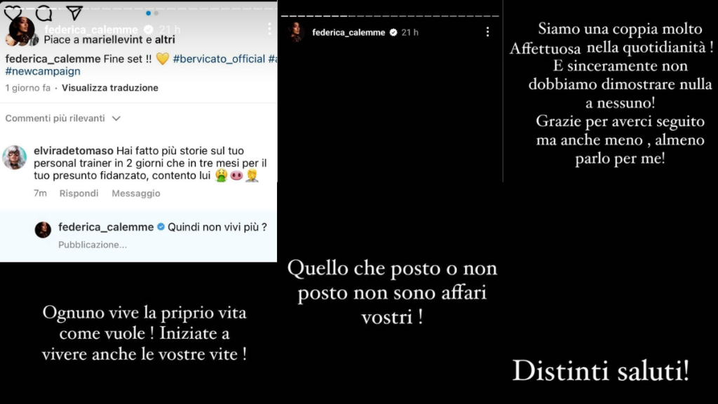 FEDERICA CALEMME RITORNA A RISPONDERE ALLE ACCUSE – Dopo un periodo lontana dai riflettori, Federica Calemme si sta godendo la sua relazione lontana dai riflettori, questo non è bastato a farla andare su tutte le furie, infatti si è trovata a dover rispondere ad un commento che le è stato fatto sotto un post della sua pagina Instagram. L’ex gieffina non jha perso tempo a rispondere a Doc a chi l’accusa di postare troppe storie sulla sua pagina social. Ecco le sue storie: