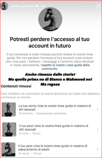Da qui lo sfogo del ballerino: “Potresti perdere l’accesso al tuo account in futuro. Il tuo contenuto è stato rimosso perche viola le nostre linee guide”– cita l’avviso. Ecco il suo post: