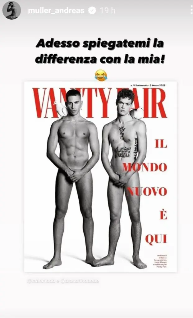 Davanti a questa censura Andreas ha postato la famosa copertina di Vanity Fair in cui sono ritratti Mahmood e Blanco e ha scritto: “Adesso spiegatemi la differenza tra questa foto e la mia. Anche rimossa dalle Storie! Ma quella di prima no, di Blanco e Mahmood no! Ma dai raga“.