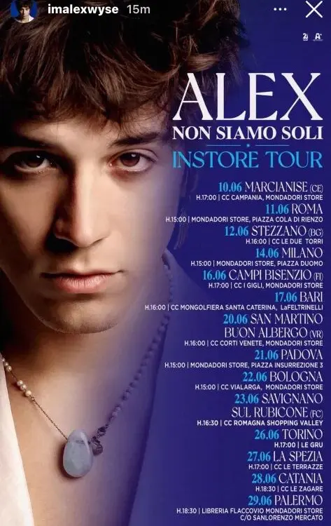 Il nuovo Ep sarà disponibile dal 10 giugno 2022 e contiene sei canzoni tra cui: “Sogni al cielo”, “Accade”, “Senza chiedere permesso”. Il cantante proprio in questa data inizia il suoi “Instore Tour”, in cui incontrerà i fan che hanno così la possibilità di fare una foto e avere un autografo dal cantante. Talento, grande interpretazione e un’estensione vocale incredibile, hanno fatto di Alex il vero protagonista di quello che sarà un’estate ricca di impegni. Cuore tenero o occhi da “Bamby” hanno conquistato proprio tutti. Ecco tutte le date: