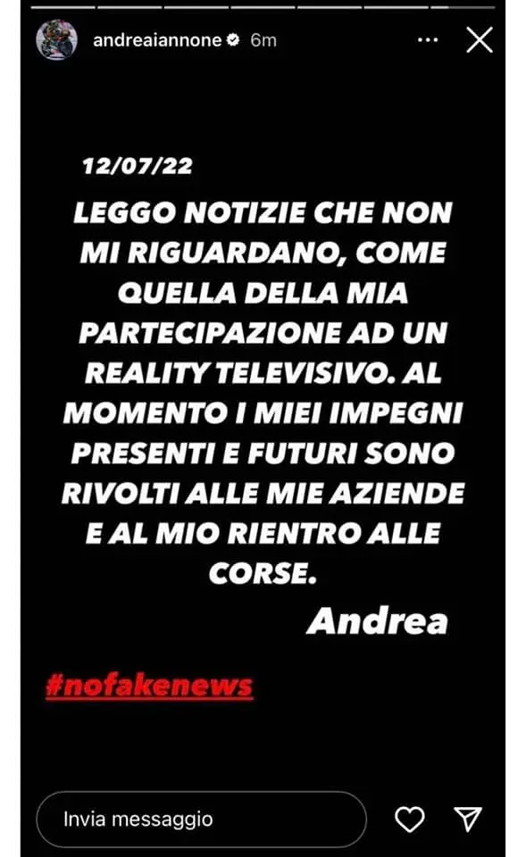GF VIP 7: LE PAROLE DI ANDREA IANNONE, DATO PER POSSIBILE CONCORRENTE DEL REALITY DI ALFONSO SIGNORINI- Andrea Iannone, che nelle scorse ore sembrava poter essere un nuovo concorrente del GF VIP 7, ha prontamente smentito, tramite il suo profilo Instagram ufficiale la notizia. Ecco la story pubblicata dal motociclista: