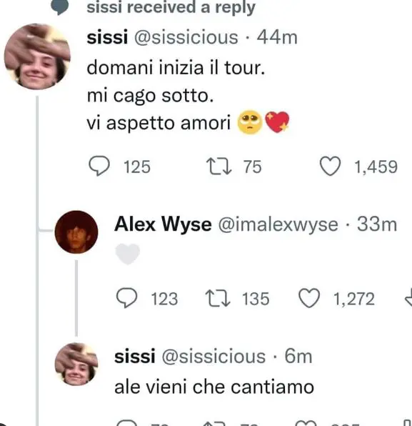 Alex Wyse ha subito risposto con un cuore bianco, a soccorrere le ansie della sua amica, lui che conosce bene l’attimo prima di doversi esibire davanti al pubblico, lo stesso in un’intervista ha dichiarato a come si sente sul palco. Ecco le prossime date per poter vedere la cantante live.
