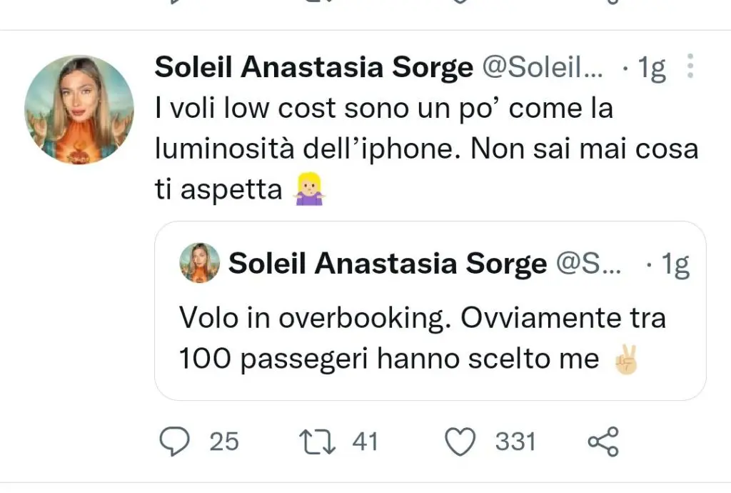 Soleil Sorge ironicamente ha poi aggiunto: “Per fortuna ho poche tette e sono partita”. In tanti tra i suoi fan, nei commenti, sottolineano che ha tanto cervello, bellezza e di essere molto simpatica. Insomma, anche i vip soffrono, verrebbe da dire. A causa di una eccessiva prenotazione di biglietti rispetto all’effettiva capienza dell’aereo, l’influencer italo-americana rischiava di perdere il suo volo. Cosa ne pensate? Continuate a commentare insieme a noi sui social e restate connessi!