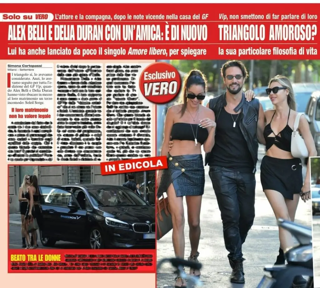“I tre sono super affiatati. Le due si baciano in mezzo alla strada senza curarsi degli occhi indiscreti” – ha scritto il noto settimanale. In tanti hanno notato una certa somiglianza con la ragazza che ha partecipato al nuovo videoclip di Alex Belli. Infatti, da poco l’ex gieffino ha lanciato il suo nuovo singolo Amore libero e sembra che la ragazza sia proprio la stessa. “Più che un amore libero questo sembra un vero e proprio harem” -recita.