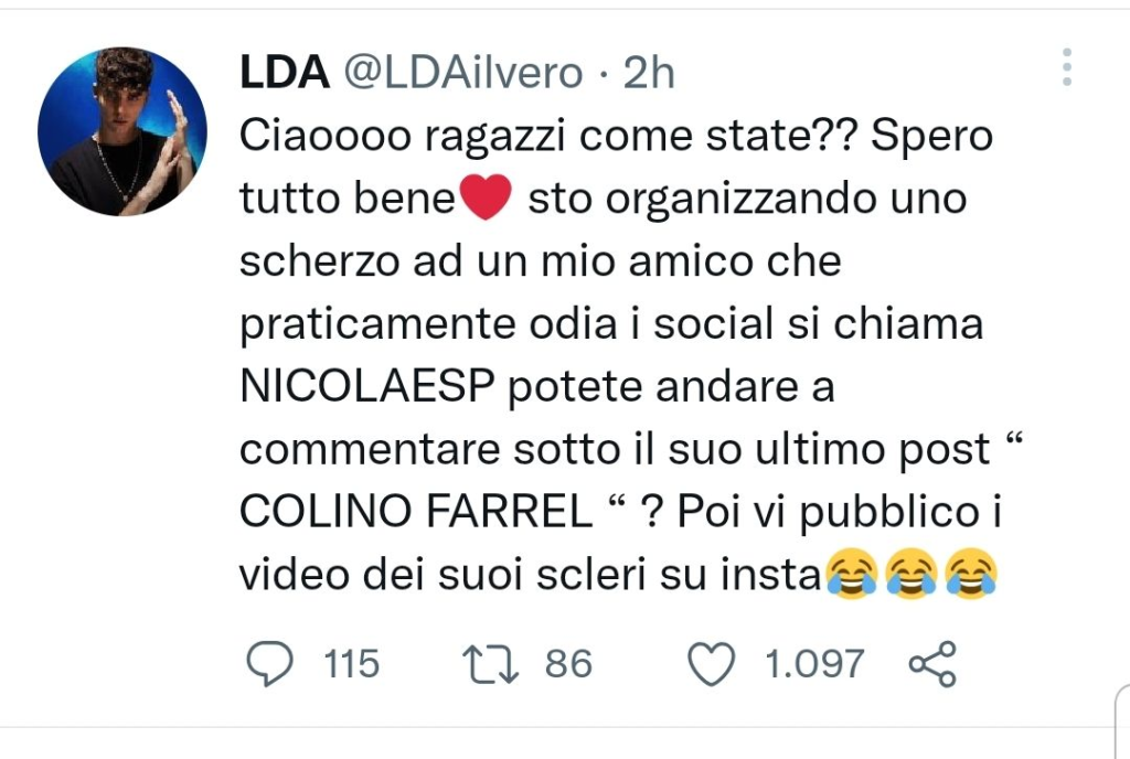 LDA, IL SUO SCHERZA DIVENTA VIRALE – Simpatico e intrattenitore, Lda, dopo la sua esperienza ad Amici 21, il cantante napoletano non ha smesso di acquistare consensi. Molto attivo suo social, si è divertito con i suoi follower in un gioco che ha coinvolto tutti i fan. Ha postato un messaggio sulla sua pagina Twitter, con una richiesta, ecco cosa ha scritto: