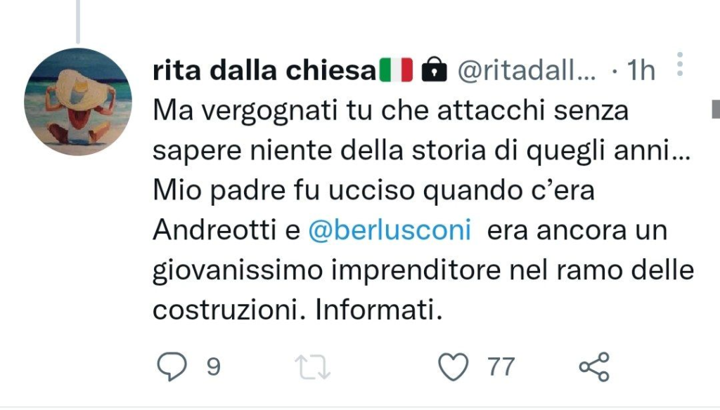 “Vergognati tu che attacchi senza sapere niente della storia di quegli anni… Mio padre fu ucciso quando c’era Andreotti e Berlusconi era ancora un giovanissimo imprenditore nel ramo della costruzioni. Informati” – ha replicato la ex conduttrice. Insomma, Rita, toccata nel suo dolore, questa volta ha dovuto rispondere, perché le scelte di una persone non devono ricadere sui propri cari. E voi cosa ne pensate? Restate connessi.