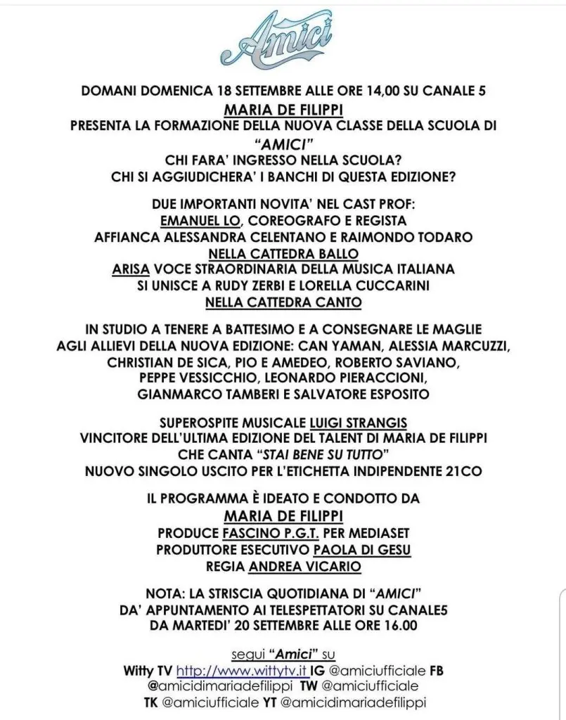 Proprio per questo Mediaset ha deciso di cambiare la programmazione e la messa in onda della prima puntata di Amici 22 sarà Martedì 20. Dunque per scoprire le prime novità relative all’ingresso in casetta di cantanti e ballerini, bisognerà attendere 24 ore in più. Intanto, appuntamento assolutamente imperdibile per la prima puntata del pomeridiano: domani, Domenica 17 Settembre, nel pomeriggio alle ore 14 su Canale 5 ci sarà la formazione della classe. Ecco quanto comunica Mediaset: