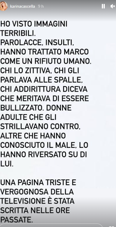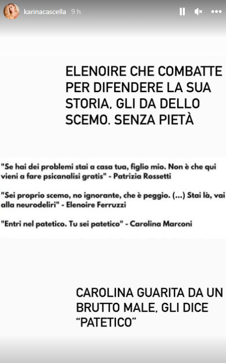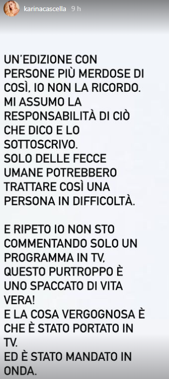 KARINA CASCELLA, INDIGNATA PER CIO’ CHE STA ACCADENDO IN UN PROGRAMMA TELEVISIVO- Ad aggiungersi alla liste degli indignati, oltre al web, all’esperta di gossip, personaggi tv e giornalisti, si aggiunge l’opinionista Karina Cascella. Attraverso la sua pagina Instagram pubblica una storia che lascia poco all’immaginazione. L’influencer definisce l’accaduto: “Una pagina triste e vergognosa della televisione”- rivolgendosi proprio al programma, che aveva già pesantemente criticato settimane fa, in merito alla discusione tra Elenoire e Luca, e ai personaggi della casa, che sono ignari del polverone che hanno sollevato sul web. Ecco il suo sfogo: