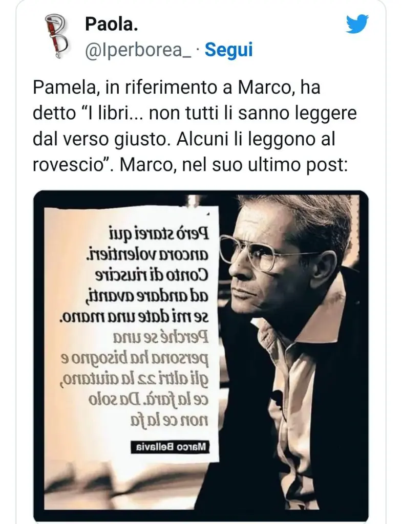 Dopo queste parole, Marco Bellavia ha pubblicato una foto di un libro alla rovescia, proprio per sottolineare il suo “si legge al rovescio”. Ecco lo scatto: