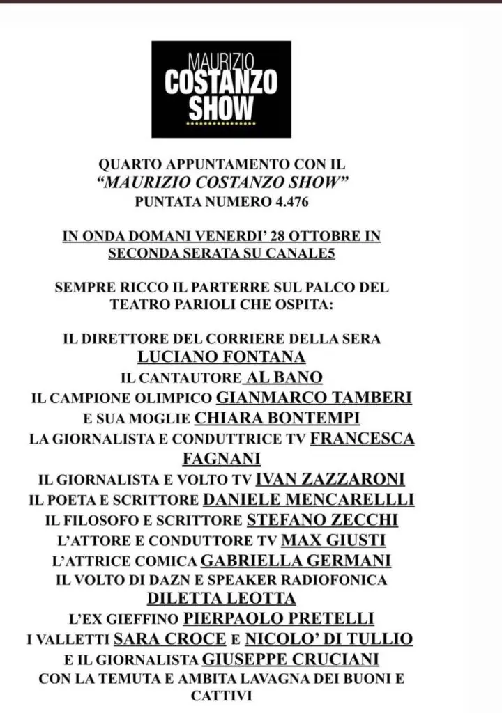 MAURIZIO COSTANZO SHOW: SVELATI GLI OSPITI DELLA PUNTATA DI VENERDI’ 28 OTTOBRE, C’E’ ANCHE PIERPAOLO PRETELLI- Manca sempre meno alla nuova puntata del Maurizio Costanzo Show, nota trasmissione condotta dal marito di Maria De Filippi, che andrà in onda domani, 28 Ottobre, a partire dalle ore 23.30 su Canale 5. Ecco il comunicato ufficiale di Mediaset, che rivela gli ospiti che saranno presenti: