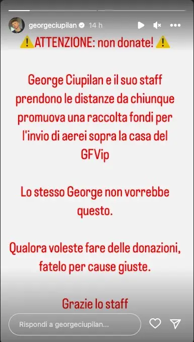 GF VIP 7: INTERVIENE IL SUO STAFF, ECCO PER QUALE MOTIVO- George Ciupilan, concorrente del GF Vip 7, Reality Show condotto da Alfonso Signorini e super seguito in Italia da milioni di telespettatori, ha ricevuto nel corso delle ultime ore, un aereo di sostegno dai fan. Tuttavia, tale gesto ha infastidito lo staff: sono circa le 20 di ieri sera quando interviene pubblicando la seguente Story