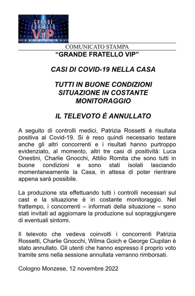Insomma, una bella gatta da pelare adesso per autori e concorrenti. I ragazzi, pur essendo in buone condizioni cliniche, sono stati posti immediatamente in isolamento. Per il resto del gruppo continua il giro di tamponi, con controlli periodici nel giro delle prossime ore. Televoto dunque annullato: tutti coloro che hanno già espresso la propria preferenza saranno rimborsati. Al momento la diretta del GF VIP 7, inizialmente in programma per il 14 Novembre 2022 su Canale 5, non sembra a rischio, ma tutto dipenderà dalle condizioni generali dei partecipanti al Reality. Restate connessi per ulteriori e tempestivi aggiornamenti sul nostro sito e sulle nostre pagine social ufficiali.