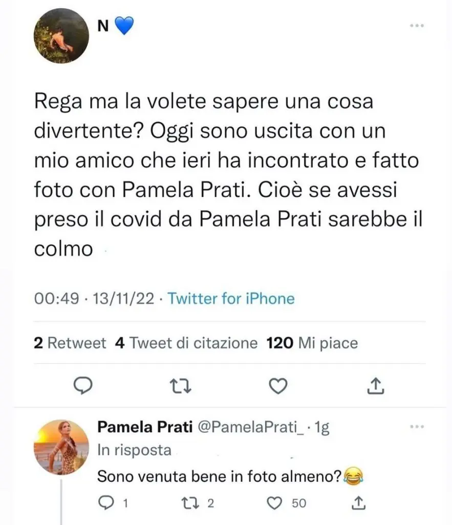Sul web la vicenda che sta coinvolgendo la casa ha colpito tutti i telespettatori, e hanno creato una mappa di tutti i possibili contatti stretti. Un fan ha così raccontato sui social di aver un amico che ha fatto una foto con Pamela. La vippona ha subito scherzato e commentato l’accaduto con molta ironia. Ecco la risposta della gieffina: