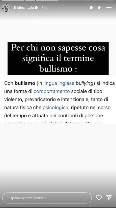 GF VIP 7: CLIZIA INCORVAIA INTERVIENE PER DIFENDERE MICOL E LA MADRE (FOTO)- Dopo le polemiche derivate dalle stories pubblicate su Instagram dalla madre di Micol e Clizia Incorvaia, la sorella maggiore è intervenuta per difendere l’attuale gieffina e lo ha fatto tramite i social. Ecco la foto della definizione di bullismo data dalla compagna di Paolo Ciavarro, che è divenuta subito virale in rete: