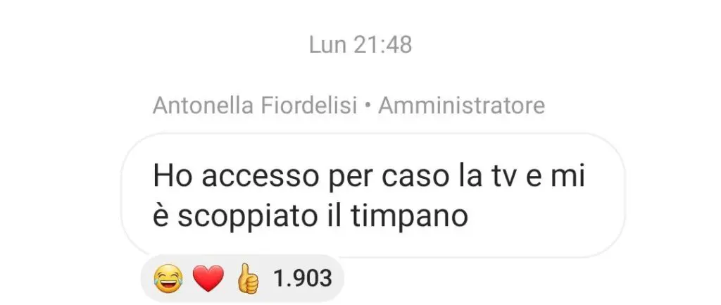 Nello specifico, Antonella ha espresso tutto il suo fastidio per l’entrata di Giselda Torresan, giovane operaia veneta, già seguitissima sul web, la quale ha un tono di voce piuttosto alto che non sembra andare troppo a genio alla Fiordelisi. Ecco lo screen della sua rivelazione sul suo Canale Broadcast Instagram ufficiale: