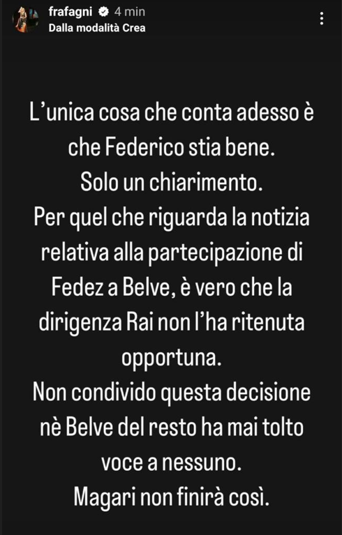 Ecco riportate, di seguito, le dichiarazioni di Francesca Fagnani: “L’unica cosa che conta adesso è che Federico stia bene. Solo un chiarimento. Per quel che riguarda la notizia relativa alla partecipazione di Fedez a Belve, è vero che la dirigenza Rai non l’ha ritenuta opportuna. Non condivido questa decisione né Belve del resto ha mai tolto voce a nessuno. Magari non finirà così”. Insomma, Corona sì e Fedez no: cosa ne pensate?