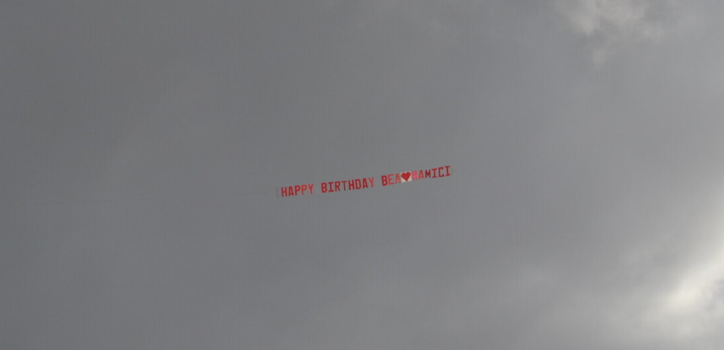 Ecco lo scatto che mostra lo striscione pensato e scritto dai suoi amici per il suo compleanno: