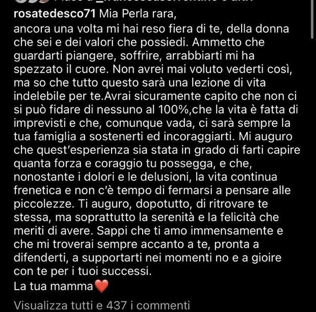Ecco il dolce messaggio scritto dalla mamma di Perla Vatiero sui social: