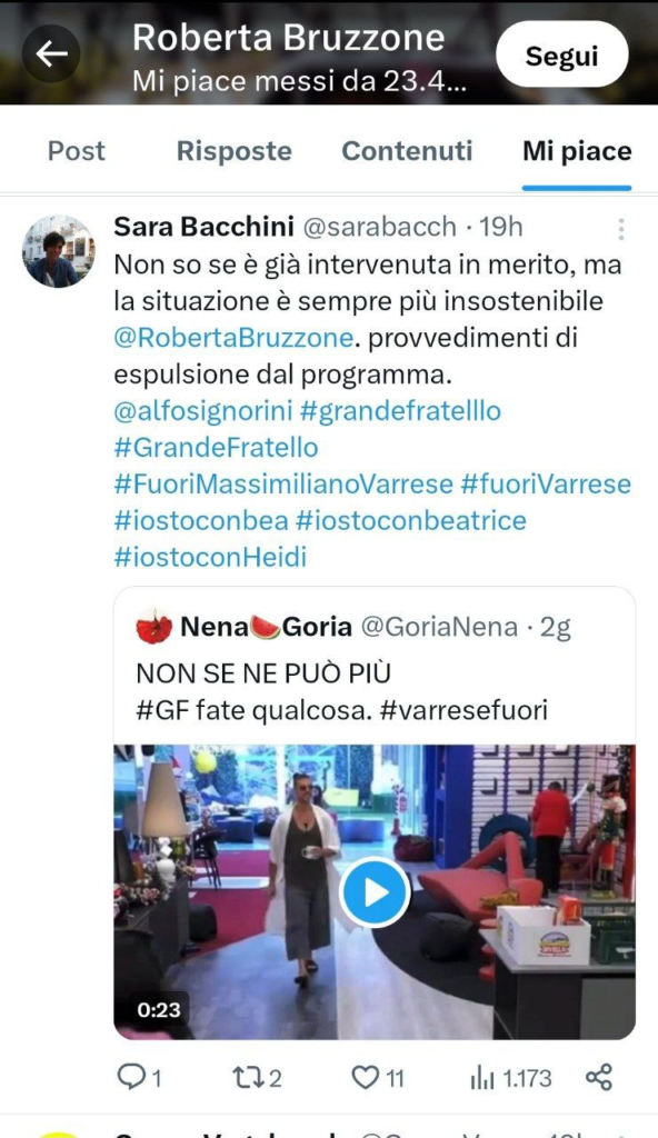 La famosa criminologa su Twitter ha messo un like a un Tweet in cui è stata taggata, che recitava: “Non so se è già intervenuta in merito, ma la situazione è sempre più insostenibile. Provvedimenti di espulsione dal programma. Fuori Massimiliano Varrese, fuori Varrese“.