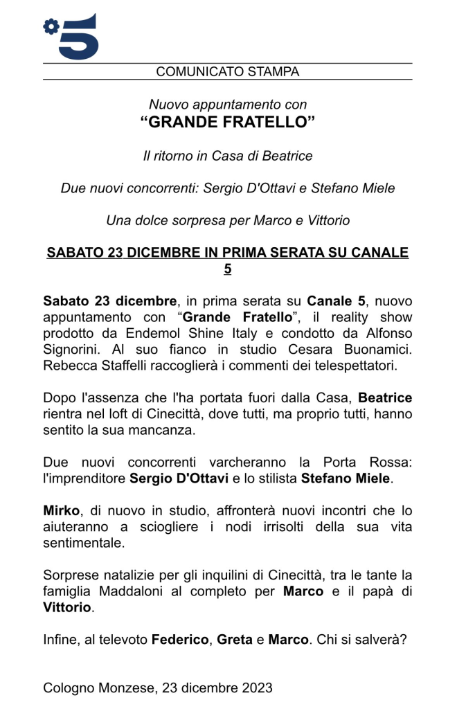 Come reagiranno Marco e Vittorio quando rivedranno i rispettivi parenti? Chi fra Maddaloni, Massaro e la Rossetti risulterà il meno amato, finendo quindi a rischio eliminazione per il prossimo decisivo appuntamento di sabato 30 dicembre 2023 che decreterà l’uscita di un inquilino dalla Casa del GF? Per scoprire tutte le novità e i verdetti, accendete Canale 5 intorno alle 21.30 e godetevi lo spettacolo orchestrato da Signorini.