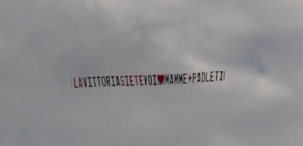 Ecco lo striscione dei followers per i Paoleti: “LA VITTORIA SIETE VOI ❤️ MAMME + PAOLETI”.