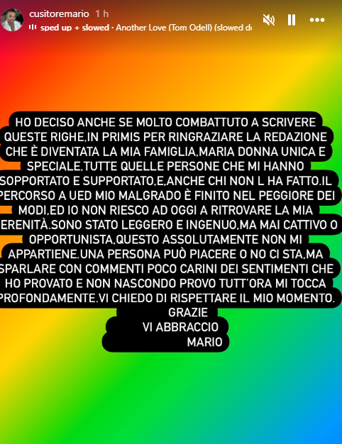Mario ha postato sul suo profilo Instagram un video del film le dichiarazioni di Mario Cusitore: “Ho deciso io, anche se molto combattuto, di scrivere queste poche righe. In primis, per ringraziare la Redazione che è diventata la mia famiglia. Maria, donna unica, speciale. Tutte quelle persone che mi hanno sopportato e supportato. E anche chi non l’ha fatto. Il percorso a Uomini e Donne mio malgrado è finito nel peggiore dei modi ed io non riesco a oggi a ritrovare la mia serenità. Sono stato leggero e ingenuo, ma mai cattivo o opportunista. Questo assolutamente non mi appartiene. Una persona può piacere o no, ci sta. Ma sparlare con commenti poco carini dei sentimenti che ho provato e non nascondo provo tutt’ora. Mi tocca profondamente. Vi chiedo di rispettare il mio momento. Grazie. Vi abbraccio, Mario”.