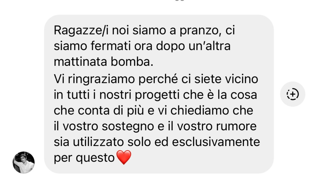 Ecco riportate, di seguito, le parole di Mirko: “Ragazze/i noi siamo a pranzo, ci siamo fermati dopo un’altra mattinata bomba. Vi ringraziamo perché ci siete vicini in tutti i nostri progetti, che è la cosa che conta di più e vi chiediamo che il vostro sostegno e il vostro rumore sia utilizzato solo ed esclusivamente per questo”.