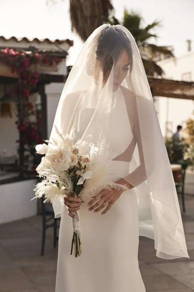 Per la cerimonia, Angela ha indossato una versione personalizzata del modello Alzina della collezione Atelier Pronovias MAIN 2025. Un abito a colonna in crepe con collo all’americana e uno strascico composto da una cascata di volant in organza. Questo abito è stato confezionato nell’Atelier e ha richiesto 40 ore per il modello e 80 ore per la confezione.