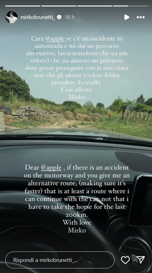 Ecco riportate, di seguito, le parole di Mirko: “Cara apple se c’è un incidente in autostrada e mi dai un percorso alternativo, assicurandomi che sia più veloce, che sia almeno un percorso dove posso proseguire con la macchina, non che gli ultimi 200 km debba prendere il cavallo. Con affetto, Mirko”, ha scritto Brunetti sul suo profilo Instagram ufficiale, ironizzando sull’episodio che gli è capitato.