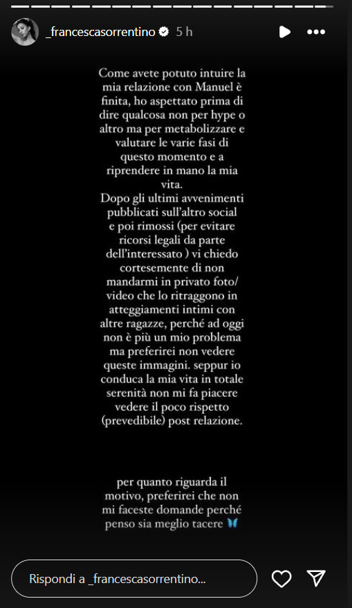 Ecco le parole di Francesca: “Come avete potuto intuire la mia relazione con Manuel è finita, ho aspettato prima di dire qualcosa non per hype o altro per metabolizzare e valutare le varie fasi di questo momento e a riprendere in mano la mia vita. Dopo gli ultimi avvenimenti pubblicati sull’altro social e poi rimossi (per evitare ricorsi legali da parte dell’interessato) vi chiedo cortesemente di non mandarmi foto/video in privato che lo ritraggono in atteggiamenti intimi con altre ragazze, perché ad oggi non è più un mio problema, ma preferirei non vedere queste immagini, seppur io conduca la mia vita in totale serenità non mi fa piacere vedere il poco rispetto (prevedibile) post relazione. Per quanto riguarda il motivo, preferirei che non mi faceste domande perché penso sia meglio tacere”.