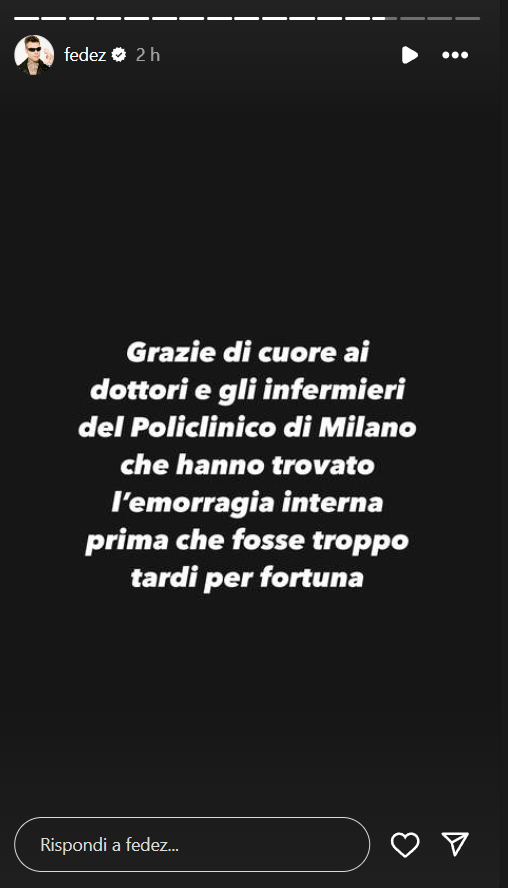 FEDEZ AGGIORNA CIRCA LE SUE CONDIZIONI DI SALUTE: COS’HA DICHIARATO IL RAPPER ED EX MARITO DI CHIARA FERRAGNI. LE SUE PAROLE VIRALI (FOTO)- Nel corso delle ultime ore, Fedez, ha aggiornato circa le sue condizioni di salute, fortunatamente in netto miglioramento rispetto a qualche ora fa. Scopriamo insieme cos’ha asserito – nel dettaglio – il celebre cantante ed ex marito di Chiara Ferragni, ricoverato all’ospedale San Raffaele di Milano.