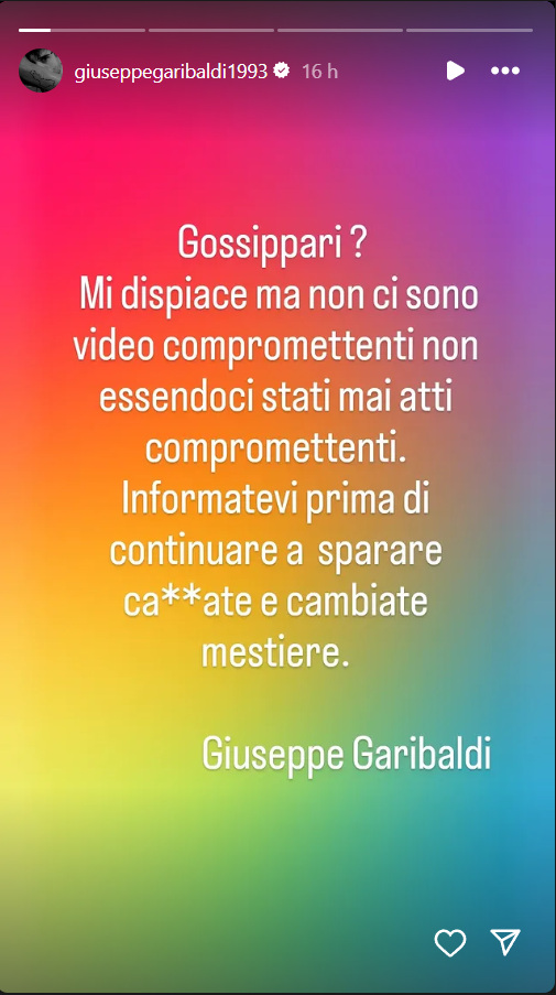 Ecco le parole di Giuseppe: “Gossippari? Mi dispiace ma non ci sono video compromettenti, non essendoci stati mai atti compromettenti. Informatevi prima di continuare a sparare ca**ate e cambiate mestiere“, ha concluso Garibaldi, a muso duro contro gli esperti o pseudo-tali.