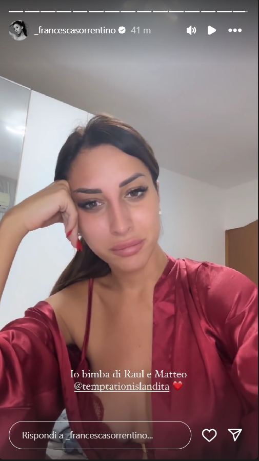 TEMPTATION ISLAND, LE DICHIARAZIONI DI FRANCESCA SORRENTINO SU RAUL E MATTEO: “MI PIACCIONO TANTISSIMO, SONO MOLTO EMOTIVI”- Francesca Sorrentino, una delle protagoniste di “Temptation Island”, ha recentemente fatto delle dichiarazioni sorprendenti riguardo a due dei partecipanti del programma: Raul e Matteo. In una story pubblicata sul suo profilo Instagram ufficiale, la vecchia fiamma di Manuel Maura, ha infatti esclamato: “Mi piacciono tantissimo, sono molto emotivi“, confermando di seguire ancora il format presentato da Filippo Bisciglia, in cui fu protagonista nella scorsa edizione.