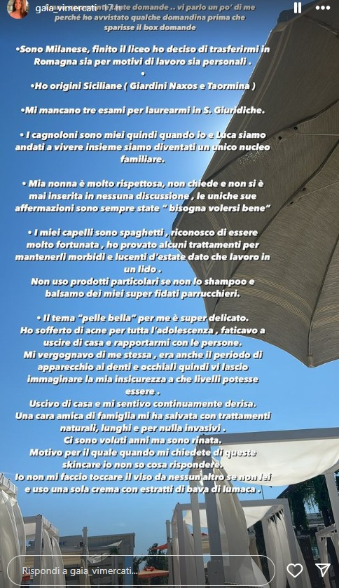 Inoltre, ha svelato: “Sono milanese, finito il liceo ho deciso di trasferirmi in Romagna sia per motivi di lavoro sia personali. Ho origini siciliane (Giardini Naxos e Taormina). Mi mancano tre esami per laurearmi in S. Giuridiche. I cagnoloni sono miei quindi quando io e Luca siamo andati a vivere insieme siamo diventati un unico nucleo familiare. Mia nonna è molto rispettosa, non chiede e non si è mai inserita in nessuna discussione, le uniche sue affermazioni sono sempre state “bisogna volersi bene”. I miei capelli sono spaghetti, riconosco di essere molto fortunata, ho provato alcuni trattamenti per mantenerli morbidi e lucenti d’estate dato che lavoro in un lido. Non uso prodotti particolari se non lo shampoo e balsamo dei super fidati parrucchieri”.