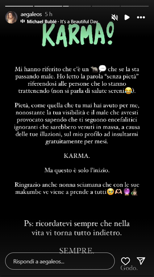 Ecco riportate, di seguito, le dichiarazioni di Anita: “Mi hanno riferito che c’è un ratto che se la sta passando male. Ho letto la parola senza pietà riferendosi alle persone che lo stanno trattenendo (non si parla di salute sereni). Pietà, come quella che tu mai hai avuto per me, nonostante la tua visibilità e il male che avresti provocato sapendo che ti seguono encefalitici ignoranti che sarebbero venuti in massa, a causa delle tue illazioni, sul mio profilo ad insultarmi gratuitamente per mesi. Karma. Ma questo è solo l’inizio. Ringrazio anche nonna sciamana che con le sue makumbe ve viene a prende a tutti. P.S.: ricordatevi sempre che nella vita vi torna tutto indietro. Sempre. Godo”.