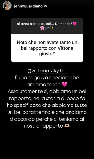 Ecco le parole di Jenny: “Vittoria Bricarello è una ragazza speciale che amiamo tanto. Assolutamente sì, abbiamo un bel rapporto; nella storia di poco fa ho specificato che abbiamo tutte un bel caratterino e che andiamo d’accordo perché ci teniamo al nostro rapporto”.