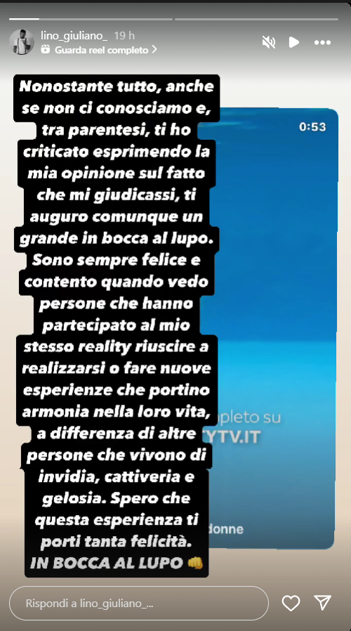 Ecco le dichiarazioni di Lino: “Nonostante tutto, anche se non ci conosciamo e, tra parentesi, ti ho criticato esprimendo la mia opinione sul fatto che mi giudicassi, ti auguro comunque un grande in bocca al lupo. Sono sempre felice e contento quando vedo persone che hanno partecipato al mio stesso reality riuscire a realizzarsi o fare nuove esperienze che portino armonia nella loro vita, a differenza di altre persone che vivono di invidia, cattiveria e gelosia. Spero che questa esperienza ti porti tanta felicità. In bocca al lupo”.