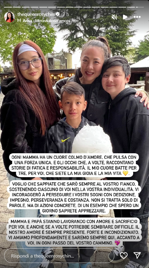 Ecco riportate, di seguito, le dichiarazioni di Rosy: “Ogni mamma ha un cuore colmo d’amore, che pulsa con una forza unica e gli occhi che a volte raccontano storie di fatica e responsabilità. Il mio cuore batte per tre, per voi, che siete la mia gioia e la mia vita. Voglio che sappiate che sarò sempre al vostro fianco. Sostenendo ciascuno di voi nella vostra individualità. Vi incoraggerò a perseguire i vostri sogni con dedizione, impegno, perseveranza e costanza. Non si tratta solo di parole, ma di azioni concrete, di un esempio che spero un giorno saprete apprezzare. Mamma e papà stanno lavorando con amore e sacrificio per voi. E anche se a volte potrebbe sembrare difficile, il nostro amore è sempre presente, forte e incondizionato. Vi amiamo profondamente e saremo sempre qui. Accanto a voi, in ogni passo del vostro cammino”.