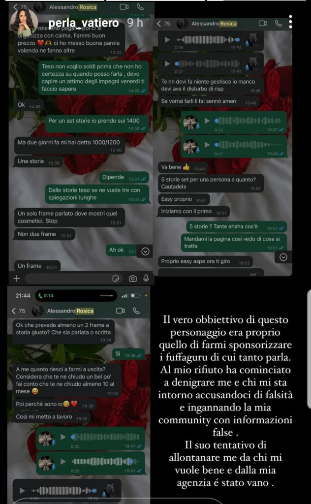 Ecco le dichiarazioni di Perla: “Il vero obbiettivo di questo personaggio era proprio quello di farmi sponsorizzare i fuffaguru di cui tanto parla. Al mio rifiuto ha cominciato a denigrare me e chi mi sta intorno accusandoci di falsità e ingannando la mia community con informazioni false. Il suo tentativo di allontanare da me da chi mi vuole bene e dalla mia agenzia è stato vano”.