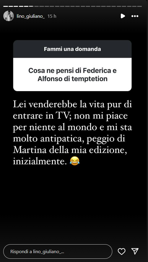 Ecco le dichiarazioni di Lino: “Lei venderebbe la vita pur di entrare in TV; non mi piace per niente al mondo e mi sta molto antipatica, peggio di Martina della mia edizione, inizialmente”.