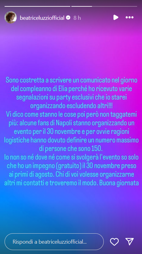 Ecco le dichiarazioni della Luzzi: “Sono costretta a scrivere un comunicato nel giorno del compleanno di Elia perché ho ricevuto varie segnalazioni su party esclusivi che io starei organizzando escludendo altri! Vi dico come stanno le cose poi però non taggatemi più: alcune fans di Napoli stanno organizzando un evento per il 30 novembre e per ovvie ragioni logistiche hanno dovuto definire un numero massimo di persone che sono 150. Io non so né dove né dome si svolgerà l’evento, so solo che ho un impegno (gratuito) il 30 novembre, preso ai primi di agosto. Chi di voi volesse organizzarne altri, mi contatti e troveremo il modo. Buona giornata”.