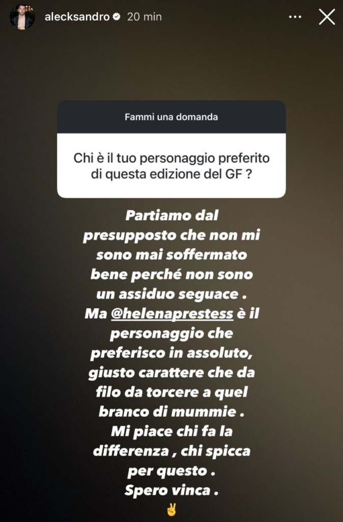 Ecco riportate, di seguito, le parole di Rizzo sui social: “Partiamo dal presupposto che non mi sono mai soffermato bene perché non sono un assiduo seguace. Ma Helena Prestes è il personaggio che preferisco in assoluto, giusto carattere che da filo torcere a quel branco di mummie. Mi piace chi fa la differenza, chi spicca per questo. Spero vinca“.