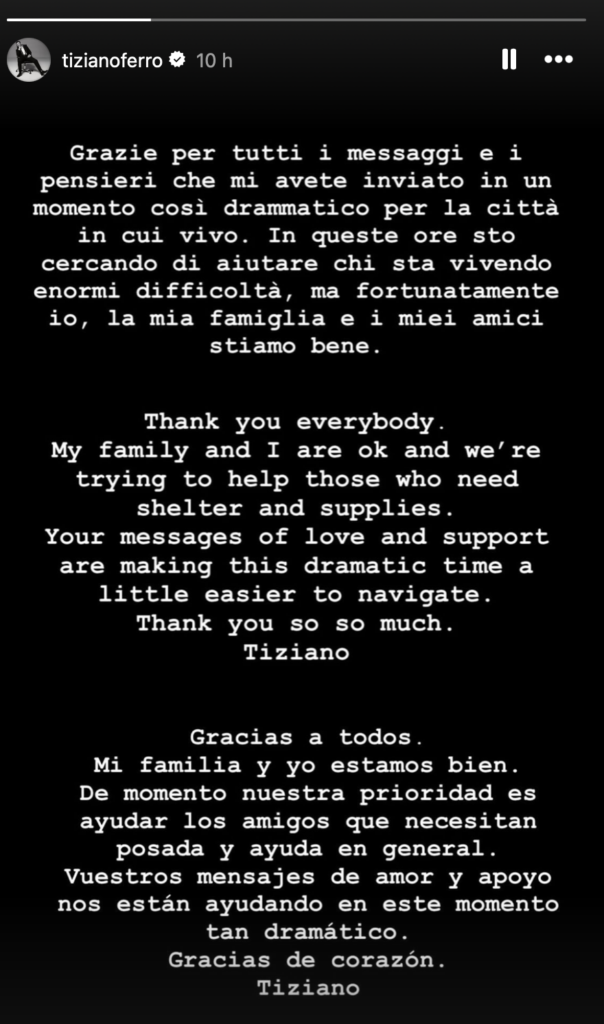 Tra le celebrità italiane che a Los Angeles ci vivono ci sono anche Tiziano Ferro e Elisabetta Canalis. L’ex velina di Striscia la Notizia ha subito raccontato di essere scappata in Italia, mentre Tiziano Ferro ha mantenuto per un po’ il silenzio, preoccupando tutti, fino al racconto su Instagram. “Grazie per tutti per i messaggi e i pensieri che mi avete inviato in un momento così drammatico. In queste ore sto cercando di aiutare chi sta vivendo enormi difficoltà, ma fortunatamente io, la mia famiglia e i miei amici stiamo bene“.