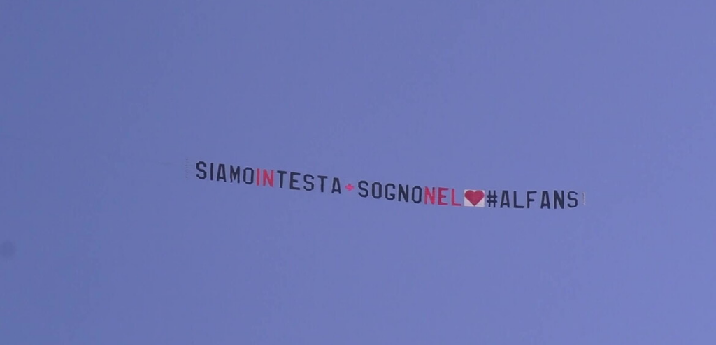 Ecco il contenuto dello striscione: “SIAMO IN TESTA + SOGNO NEL ❤️#ALFANS”.